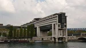 Le bâtiment du ministère de l'Économie et des Finances, situé au bord de la Seine à Paris, avec des bateaux-mouches amarrés au premier plan et un pont en arrière-plan sous un ciel nuageux.