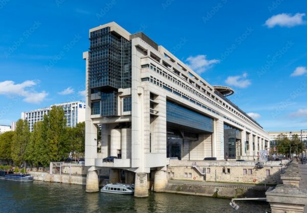Le bâtiment du ministère de l’Économie et des Finances, situé au bord de la Seine à Paris, avec des bateaux-mouches amarrés au premier plan et un pont en arrière-plan sous un ciel nuageux.